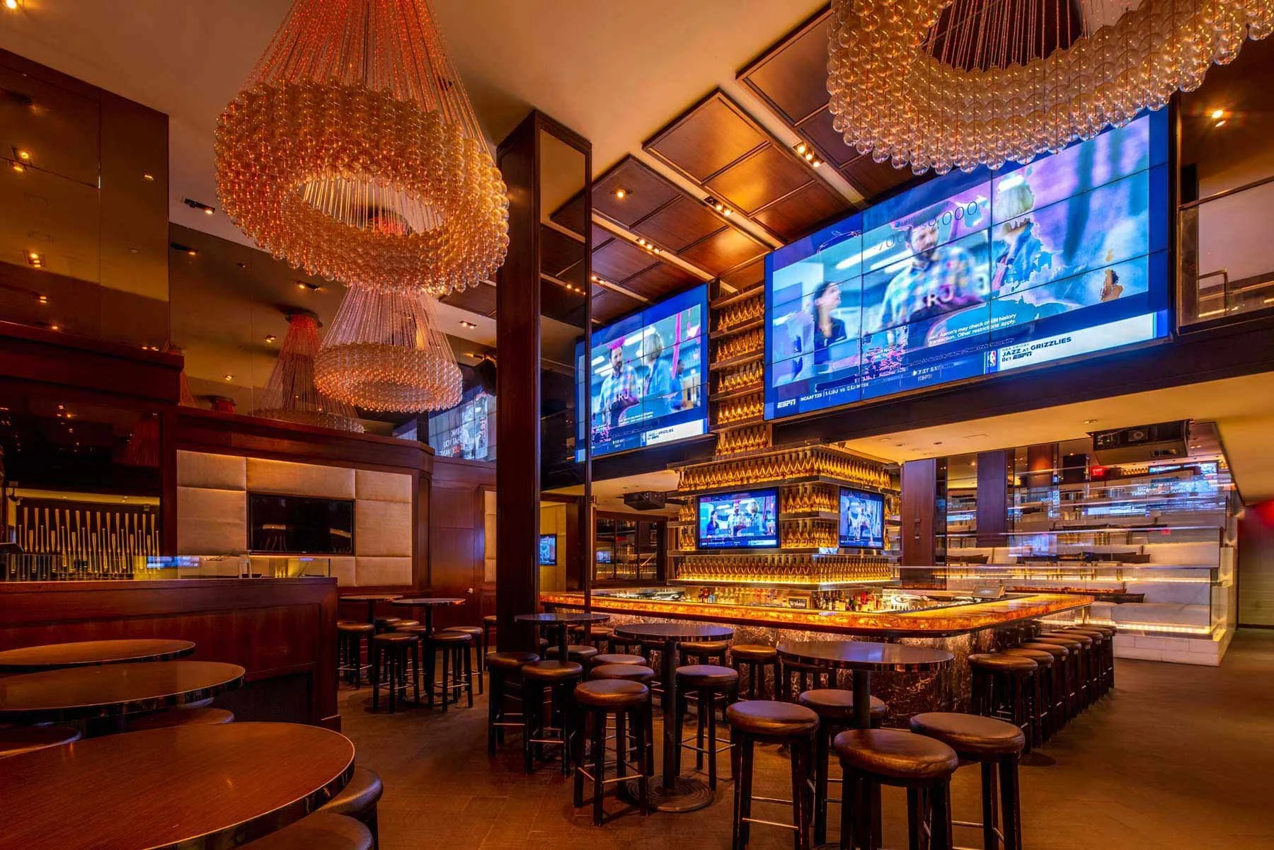 The Main Floor can accommodate anything from Corporate Events & Private Functions to Bar & Bat Mitzvahs. The interior design features a grand entrance, fiber-optic chandeliers, and cutting edge audio & visual technologies. The space includes a custom illuminated amber resin top bar encircling an 18‐foot tall Illuminated champagne tower. Supple leather upholstered wall paneling, custom walnut millwork, smoked bronze mirrors & plush lounge banquettes make the space feel luxurious. A large, marble stepped, arena style seating area can accommodate guests with a wonderful view of the 4 – 165 inch state display walls.